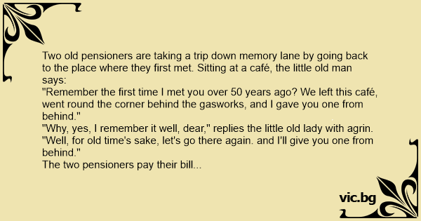 Een oud bejaard koppel ging als weekenduitstap naar de plaats waar ze elkaar het eerst ontmoet hadden. Terwijl ze in het café zitten zegt de oude man: "Herinner je nog Marie, de eerste keer, toen...
