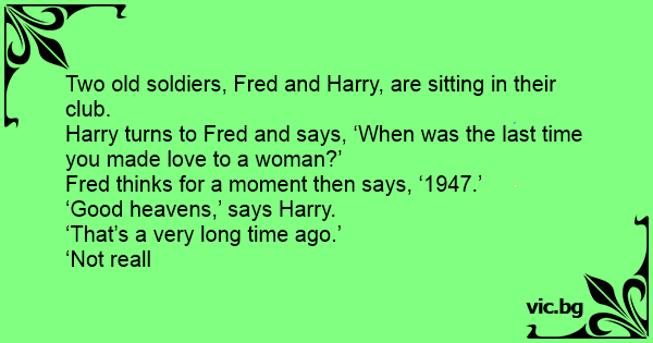 Harry turns to Fred and says, ‘When was the last time you made love to a woman?’