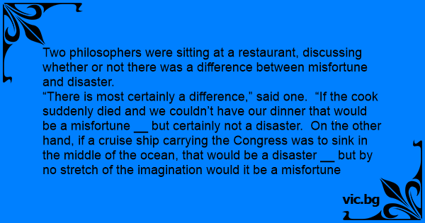 Two philosophers were sitting at a restaurant, discussing whether or not there was a difference between misfortune and disaster.