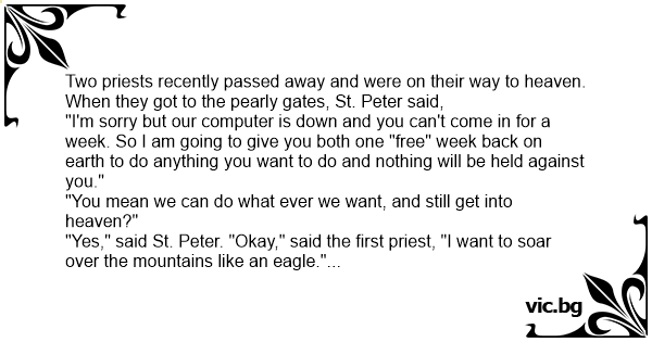 "A stud?" asked St. Peter. "Yes," said the second priest. "Okay, I'll see you in a week." Finally, the week ended and the computer was repaired. God asked to St. Peter, "Did you get the two priests back so they can join us here?"