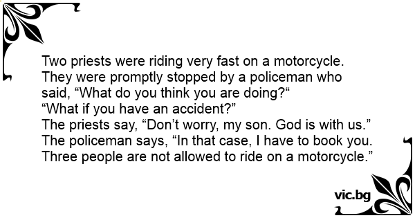 Two priests were riding very fast on a motorcycle. They were promptly stopped by a policeman who said, “What do you think you are doing?“