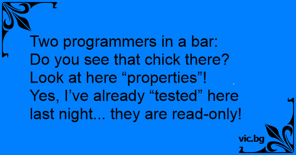 Doi programatori intr-un bar: - Vezi tipa aceia? Vezi ce "properties" are? - Da. Am "testat-o" aseara... Sunt read-only