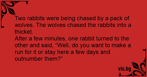 After a few minutes, one rabbit turned to the other and said, “Well, do you want to make a run for it or stay here a few days and outnumber them?”