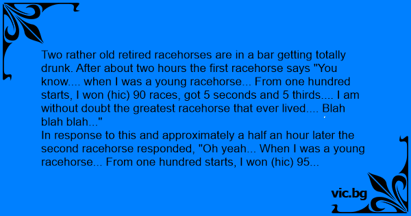 Two rather old retired racehorses are in a bar getting totally drunк. After about two hours the first racehorse says "You know.... when I was a young racehorse... From one hundred starts, I won (hic) 90 races, got 5 seconds and 5 thirds.... I am without doubt the greatest racehorse that ever lived.... Blah blah blah..."