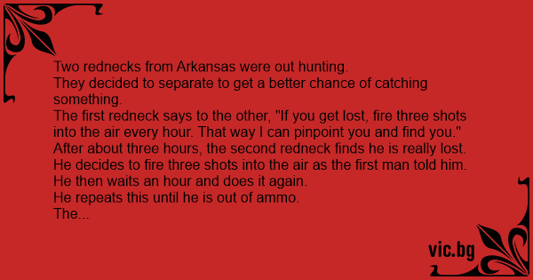 The first redneck says to the other, "If you get lost, fire three shots into the air every hour. That way I can pinpoint you and find you."