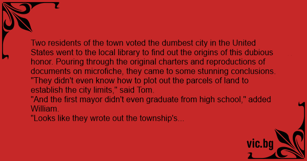 Two residents of the town voted the dumbest city in the United States went to the local library to find out the origins of this dubious honor. Pouring through the original charters and reproductions of documents on microfiche, they came to some stunning conclusions.