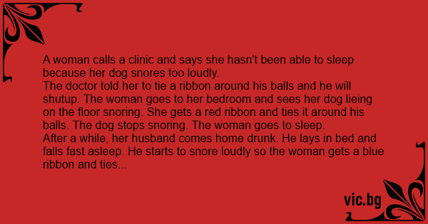 The doctor told her to tie a ribbon around his ваlls and he will shutup. The woman goes to her bedroom and sees her dog lieing on the floor snoring. She gets a red ribbon and ties it around his ваlls. The dog stops snoring. The woman goes to sleep.