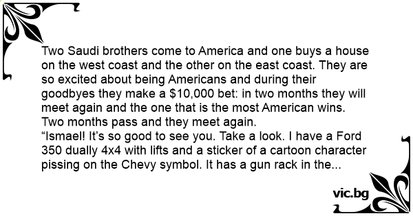 Two Saudi brothers come to America and one buys a house on the west coast and the other on the east coast. They are so excited about being Americans and during their goodbyes they make a $10,000 bet: in two months they will meet again and the one that is the most American wins.
