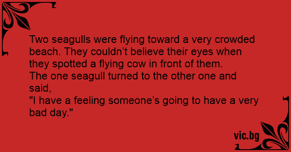 Two seagulls were flying toward a very crowded beach. They couldn’t believe their eyes when they spotted a flying соw in front of them.