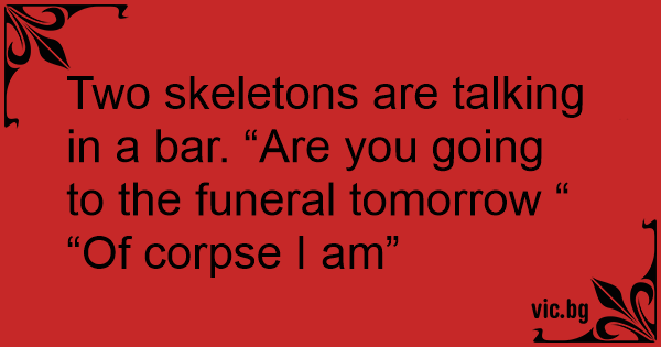 Two skeletons are talking in a bar. “Are you going to the funeral tomorrow “ “Of corpse I am”