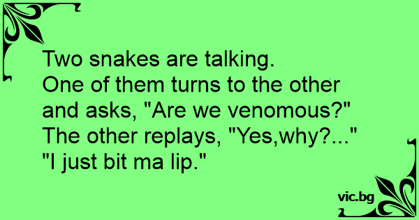 Δυο φίδια συζητάνε: - Ρε συ, ξέρεις αν είμαστε δηλητηριώδη; - Όχι δεν είμαστε, γιατί ρωτάς; - Δάγκωσα τη γλώσσα μου ρε γαμώτο!