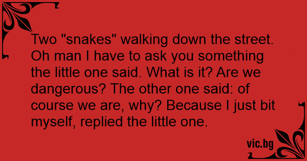 Two "snakes" walking down the street. Oh man I have to ask you something the little one said. What is it? Are we dangerous? The other one said: of course we are, why? Because I just bit myself, replied the little one.