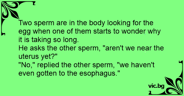 Two sреrм are in the body looking for the egg when one of them starts to wonder why it is taking so long.