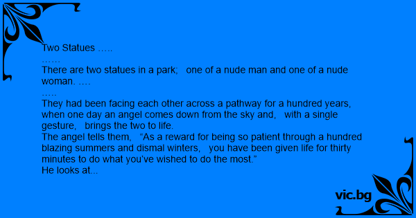 I mange år hadde to flotte statuer, en naken mann og en naken kvinne stått ved siden av hverandre ved innagangen til en offentlig park. Så en dag kom en engel ned fra himmelen og sa: - Nå har dere...