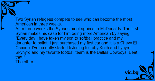 After three weeks the Syrians meet again at a McDonalds. The first Syrian makes his case for him being more American by saying: