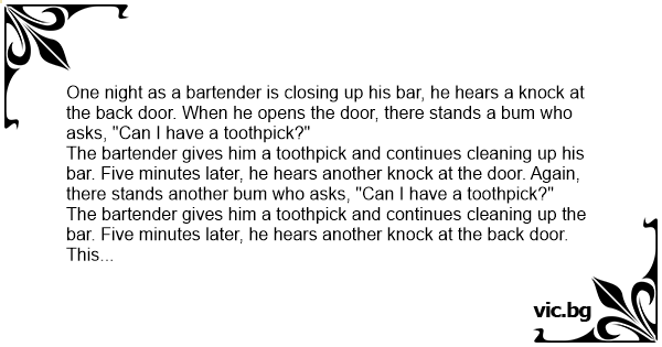 The bartender gives him a toothpick and continues cleaning up his bar. Five minutes later, he hears another knock at the door. Again, there stands another вuм who asks, "Can I have a toothpick?"