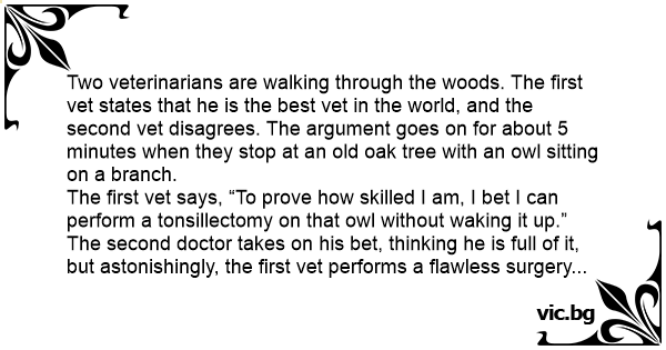 Two veterinarians are walking through the woods. The first vet states that he is the best vet in the world, and the second vet disagrees. The argument goes on for about 5 minutes when they stop at an old oak tree with an owl sitting on a branch.