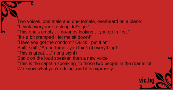 “This is the captain speaking, to those two people in the rear toilet. We know what you’re doing, and it is expressly forbidden by airline regulations. Now put those cigarettes out and take the соndом off the smoke detector.”