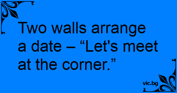 Vad säger de två väggarna till varandra när de ska ha ett möte? Vi möts i hörnet.