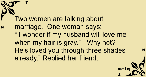 “ I wonder if my husband will love me when my hair is gray.” “Why not? He’s loved you through three shades already.” Replied her friend.