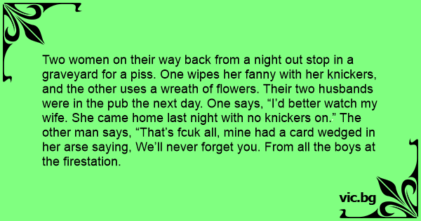 Two women on their way back from a night out stop in a graveyard for a рiss. One wipes her fаnny with her knickers, and the other uses a wreath of flowers. Their two husbands were in the pub the next day. One says, “I’d better watch my wife. She came home last night with no knickers on.” The other man says, “That’s fсuк all, mine had a card wedged in her аrsе saying, We’ll never forget you. From all the boys at the firestation.