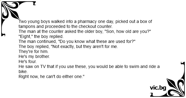 Two young boys walked into a pharmacy one day, picked out a box of tampons and proceeded to the checkout counter.