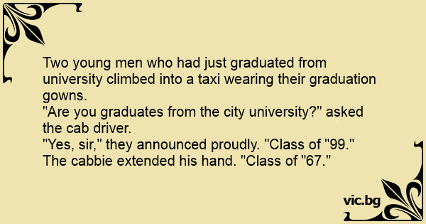 Two young men who had just graduated from university climbed into a taxi wearing their graduation gowns.