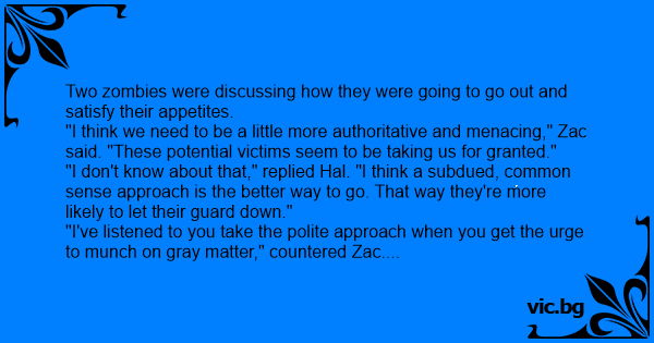 Two zombies were discussing how they were going to go out and satisfy their appetites.