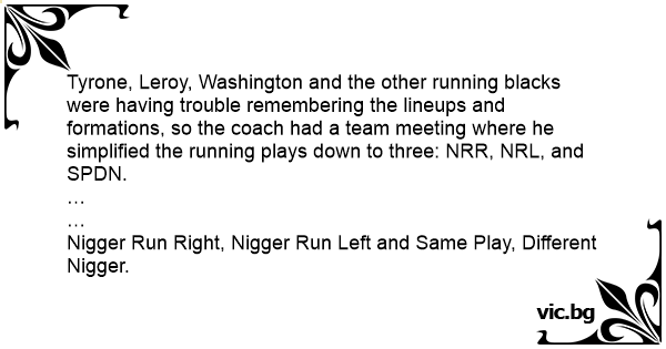 Tyrone, Leroy, Washington and the other running blacks were having trouble remembering the lineups and formations, so the coach had a team meeting where he simplified the running plays down to three: NRR, NRL, and SPDN.