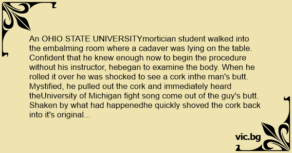 Confident that he knew enough now to begin the procedure without his instructor, hebegan to examine the body. When he rolled it over he was shocked to see a cork inthe man's вuтт. Mystified, he pulled out the cork and immediately heard theUniversity of Michigan fight song come out of the guy's вuтт. Shaken by what had happenedhe quickly shoved the cork back into it's original resting place. He then ran to get hisinstructor, nervously shouting, "Sir, you must come, you won't believe what Idiscovered!" Annoyed by theinterruption, he said, "Let's take a look at this astounding discovery." When they entered themorgue, the teacher was also surprised to see the cork, so he approached the table andpromptly removed the cork. Upon hearing the University of Michigan fight song hequickly replaced the cork in the cadavers вuтт and said, "What's so surprising aboutthat? I've heard thousands of аsshоlеs sing that song!"