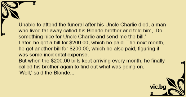 Unable to attend the funeral after his Uncle Charlie died, a man who lived far away called his Blonde brother and told him, 'Do something nice for Uncle Charlie and send me the bill.'