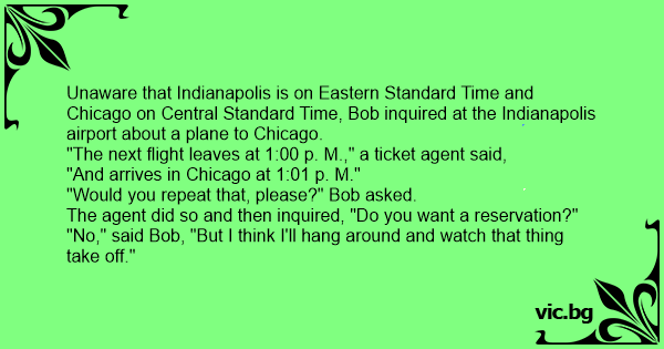 Unaware that Indianapolis is on Eastern Standard Time and Chicago on Central Standard Time, Bob inquired at the Indianapolis airport about a plane to Chicago.