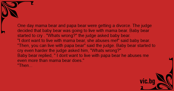 One day mama bear and papa bear were getting a divorce. The judge decided that baby bear was going to live with mama bear. Baby bear started to cry . "Whats wrong?" the judge asked baby bear.