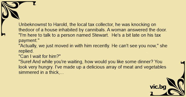 Unbeknownst to Harold, the local tax collector, he was knocking on thedoor of a house inhabited by cannibals. A woman answered the door.