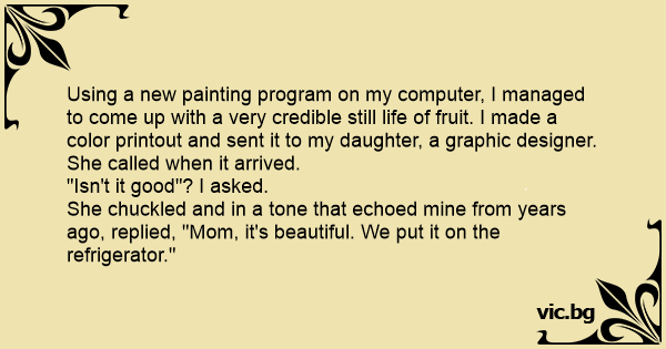 Using a new painting program on my computer, I managed to come up with a very credible still life of fruit. I made a color printout and sent it to my daughter, a graphic designer. She called when it arrived.