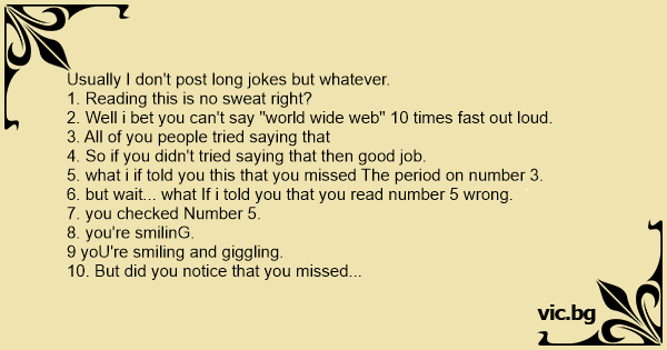 Usually I don't post long jokes but whatever. 1. Reading this is no sweat right? 2. Well i bet you can't say "world wide web" 10 times fast out loud. 3. All of you people tried saying that 4. So if you didn't tried saying that then good job. 5. what i if told you this that you missed The period on number 3. 6. but wait... what If i told you that you read number 5 wrong. 7. you checked Number 5. 8. you're smilinG. 9 yoU're smiling and giggling. 10. But did you notice that you missed the peRiod on number 7. 11. You checked but realized That there actually is a period. 12. Oh no now you're startIng to smile. 13. so by now, you Might have started to double check your periods right? 14. wEll that's good because now you will get higher marks in school but i don't need school cuz im too cool for school. Now read all the caps.