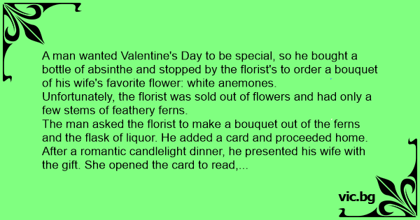 A man wanted Valentine's Day to be special, so he bought a bottle of absinthe and stopped by the florist's to order a bouquet of his wife's favorite flower: white anemones.