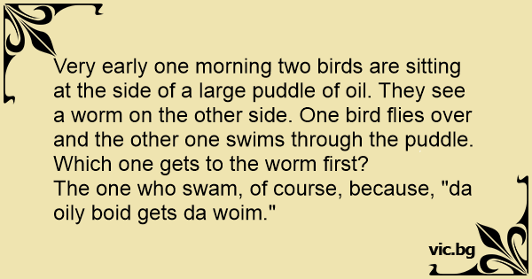 Very early one morning two birds are sitting at the side of a large puddle of oil. They see a worm on the other side. One bird flies over and the other one swims through the puddle.