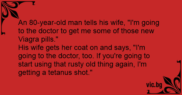82 éves bácsika a feleségének: - Elmegyek az orvoshoz. - Miért, beteg vagy? - Nem, csak annyi jót hallottam a viagráról, hogy gondoltam kipróbálom. - Várj, én is jövök. - Miért, beteg vagy? - Nem,...
