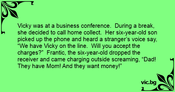 Vicky was at a business conference. During a break, she decided to call home collect. Her six-year-old son picked up the phone and heard a stranger’s voice say, “We have Vicky on the line. Will you accept the charges?” Frantic, the six-year-old dropped the receiver and came charging outside screaming, “Dad! They have Mom! And they want money!”