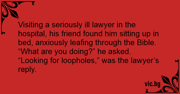 Egy ügyvéd haldoklik a kórházban, és amikor egy barátja meglátogatja, éppen a Bibliát lapozgatja kétségbeesetten. - Hát te meg mi a francot csinálsz? - kérdezi a barát. Mire az ügyvéd: - Joghézagok...