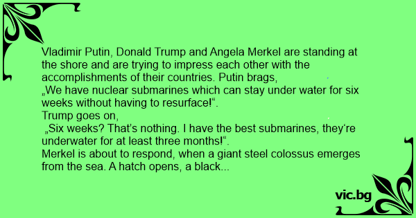 Vladimir Putin, Donald Trump and Angela Merkel are standing at the shore and are trying to impress each other with the accomplishments of their countries. Putin brags,