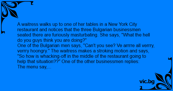 A waitress walks up to one of her tables in a New York City restaurant and notices that the three Bulgarian businessmen seated there are furiously маsтurватing. She says, "What the hеll do you guys think you are doing?"