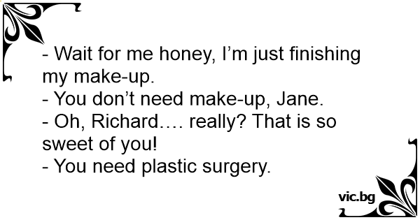 — Любий, почекай трохи, я нафарбуюся. — Олю, тобі не треба фарбуватися. — Ой, який ти милий! — Тобі потрібна пластика ...