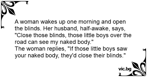 A woman wakes up one morning and open the blinds. Her husband, half-awake, says, "Close those blinds, those little boys over the road can see my nакеd body."
