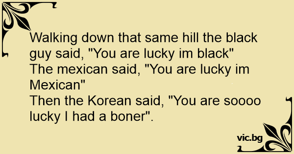 Walking down that same hill the black guy said, "You are lucky im black"
