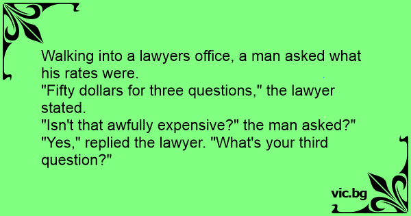 Přijde muž k právníkovi do kanceláře a ptá se, kolik si účtuje za své služby. "mám taxu 1000 korun za 3 zodspovězené otázky," zní odpověď právníka. "A není to příliš vysoká cena?" diví se muž....