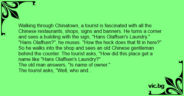 So he walks into the shop and sees an old Chinese gentleman behind the counter. The tourist asks, "How did this place get a name like "Hans Olaffsen's Laundry?"