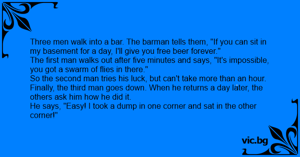 Three men walk into a bar. The barman tells them, "If you can sit in my basement for a day, I'll give you free вееr forever."