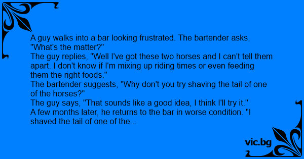 A few months later, he returns to the bar in worse condition. "I shaved the tail of one of the horses, but it grew back and I can't tell them apart again!"